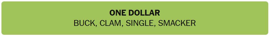 - ONE DOLLAR – BUCK, CLAM, SINGLE, SMACKER