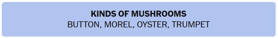 - KINDS OF MUSHROOMS – BUTTON, MOREL, OYSTER, TRUMPET