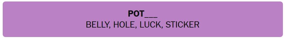- POT ___ – BELLY, HOLE, LUCK, STICKER