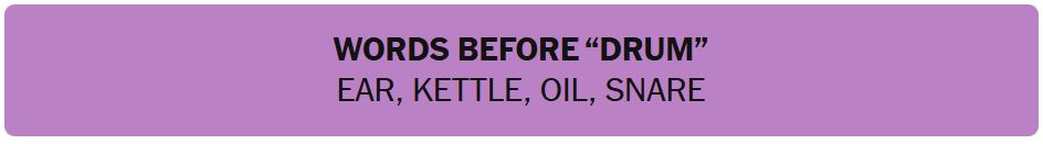 - WORDS BEFORE “DRUM” – EAR, KETTLE, OIL, SNARE