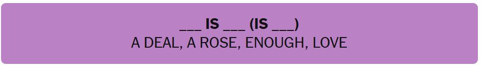 - ____ IS ____ (IS ____) – A DEAL, A ROSE, ENOUGH, LOVE