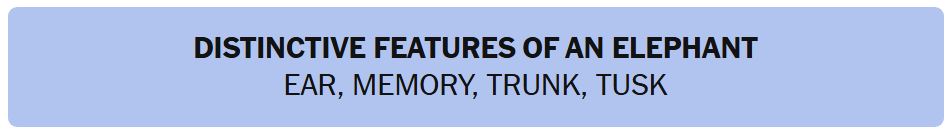 - DISTINCTIVE FEATURES OF AN ELEPHANT – EAR, MEMORY, TRUNK, TUSK