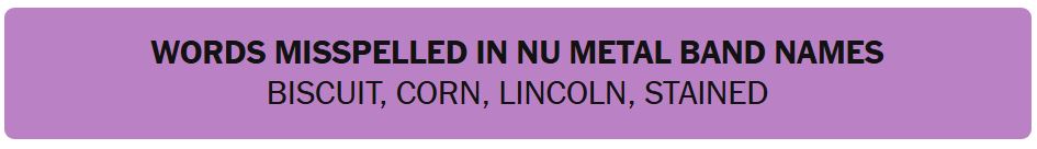 - WORDS MISSPELLED IN NU METAL BAND NAMES – BISCUIT, CORN, LINCOLN, STAINED