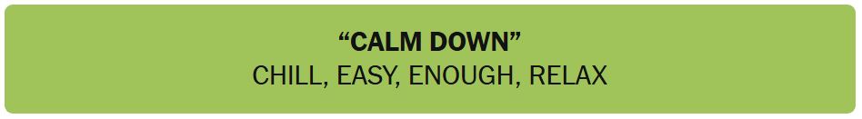 - “CALM DOWN” – CHILL, EASY, ENOUGH, RELAX