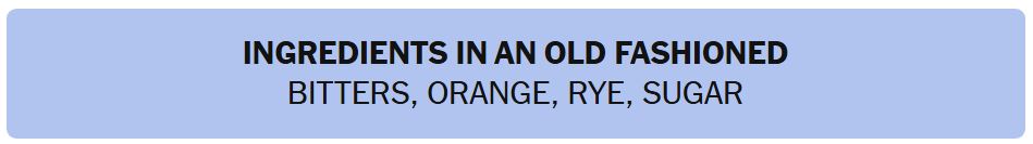 - INGREDIENTS IN AN OLD FASHIONED COCKTAIL – BITTERS, ORANGE, RYE, SUGAR