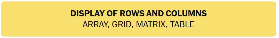 - DISPLAY OF ROWS AND COLUMNS – ARRAY, GRID, MATRIX, TABLE