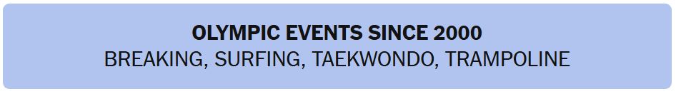 - OLYMPIC EVENTS SINCE 2000 – BREAKING, SURFING, TAEKWONDO, TRAMPOLINE