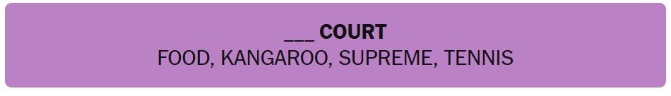 - ___ COURT – FOOD, KANGAROO, SUPREME, TENNIS