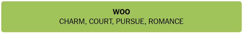 - WOO – CHARM, COURT, PURSUE, ROMANCE