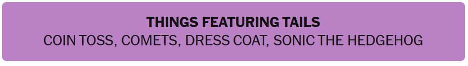 - THINGS FEATURING TAILS – COIN TOSS, COMETS, DRESS COAT, SONIC THE HEDGEHOG