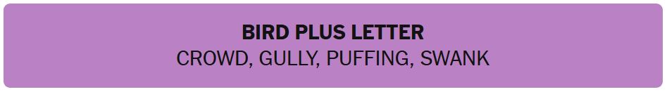 • BIRD PLUS LETTER – CROWD, GULLY, PUFFING, SWANK