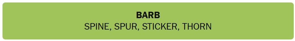 - BARB – SPINE, SPUR, STICKER, THORN