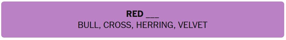 • RED ___ – BULL, CROSS, HERRING, VELVET