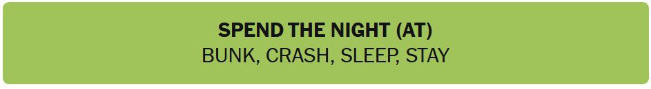 - SPEND THE NIGHT (AT) – BUNK , CRASH, SLEEP, STAY