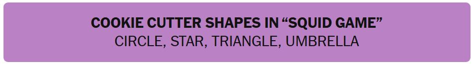 - COOKIE CUTTER SHAPES IN “SQUID GAME” – CIRCLE, STAR, TRIANGLE, UMBRELLA