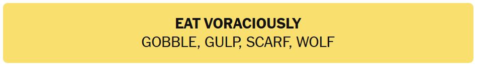 - EAT VORACIOUSLY – GOBBLE, GULP, SCARF, WOLF