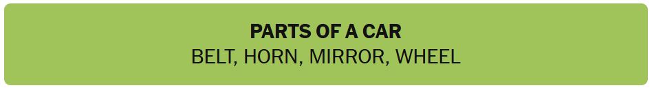 - PARTS OF A CAR – BELT, HORN, MIRROR, WHEEL
