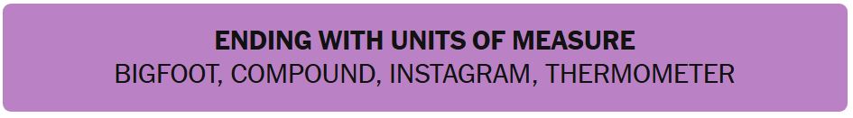 - ENDING WITH UNITS OF MEASURE – BIGFOOT, COMPOUND, INSTAGRAM, THERMOMETER