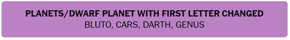- PLANETS/DWARF PLANET WITH FIRST LETTER CHANGED – BLUTO, CARS, DARTH, GENUS