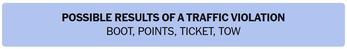 - POSSIBLE RESULTS OF A TRAFFIC VIOLATION – BOOT, POINTS, TICKET, TOW