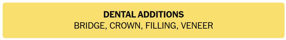 - DENTAL ADDITIONS – BRIDGE, CROWN, FILLING, VENEER
