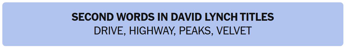 - SECOND WORDS IN DAVID LYNCH TITLES – DRIVE, HIGHWAY, PEAKS, VELVET