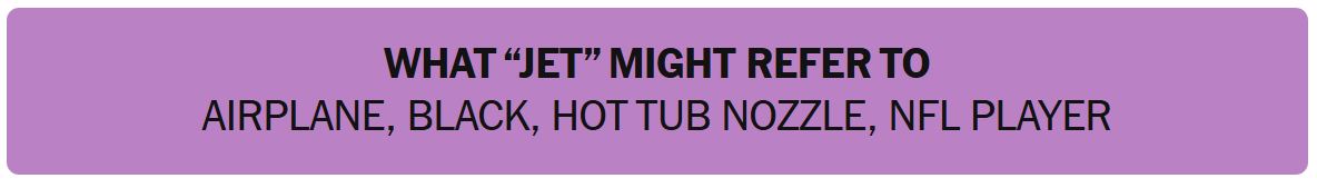 - WHAT “JET” MIGHT REFER TO – AIRPLANE, BLACK, HOT UB NOZZLE, NFL PLAYER