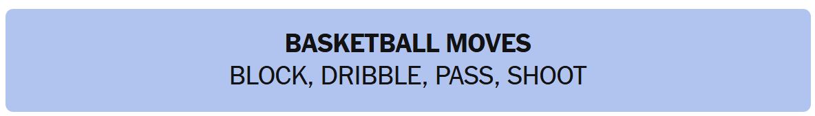 - BASKETBALL MOVES – BLOCK, DRIBBLE, PASS, SHOOT