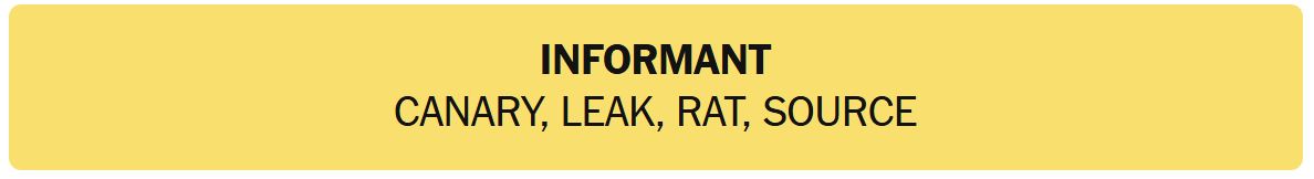 - INFORMANT – CANARY, LEAK, RAT, SOURCE