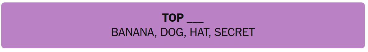 - TOP ___ – BANANA, DOG, HAT, SECRET