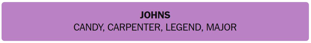 - JOHNS – CANDY, CARPENTER, LEGEND, MAJOR