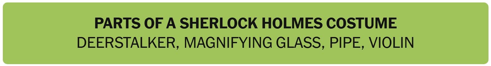 - PARTS OF SHERLOCK HOLMES COSTUME – DEERSTALKER, MAGNIFYING GLASS, PIPE, VIOLIN