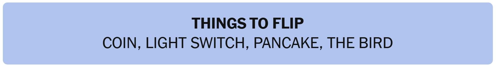 - THINGS TO FLIP – COIN, LIGHT SWITCH, PANCAKE, THE BIRD
