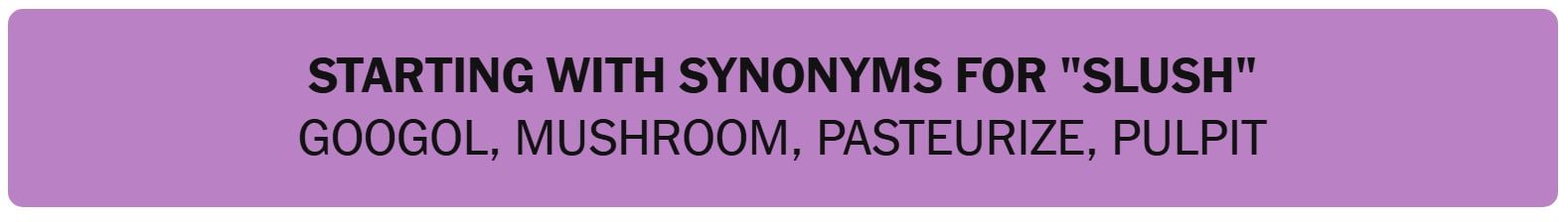 - STARTING WITH SYNONYMS FOR “SLUSH” – GOOGOL, MUSHROOM, PASTEURIZE, PULPIT