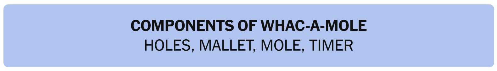 - COMPONENTS OS A WAC-A-MOLE – HOLES, MALLET, MOLE, TIMER