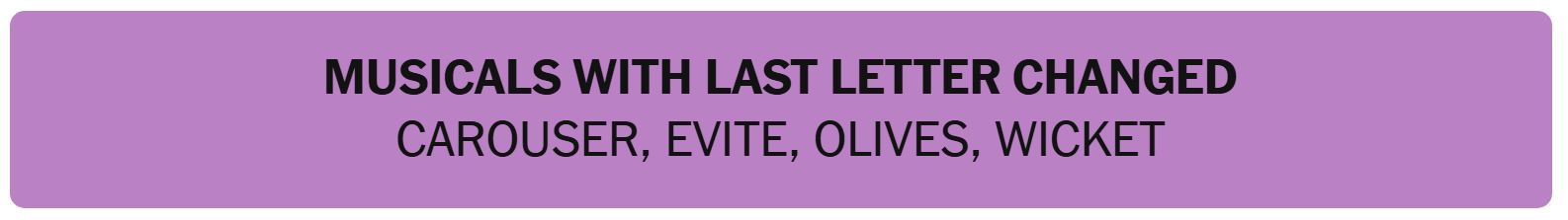 - MUSICALS WITH LAST LETTER CHANGED – CAROUSER, EVITE, OLIVES, WICKET