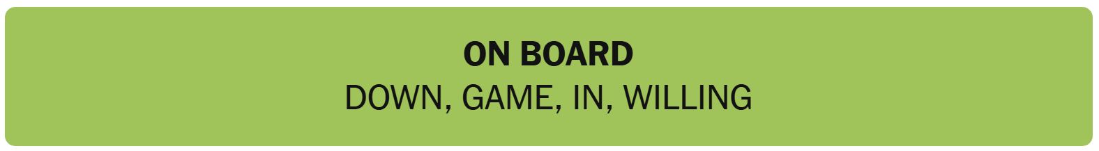 - ON BOARD – DOWN, GAME, IN, WILLING