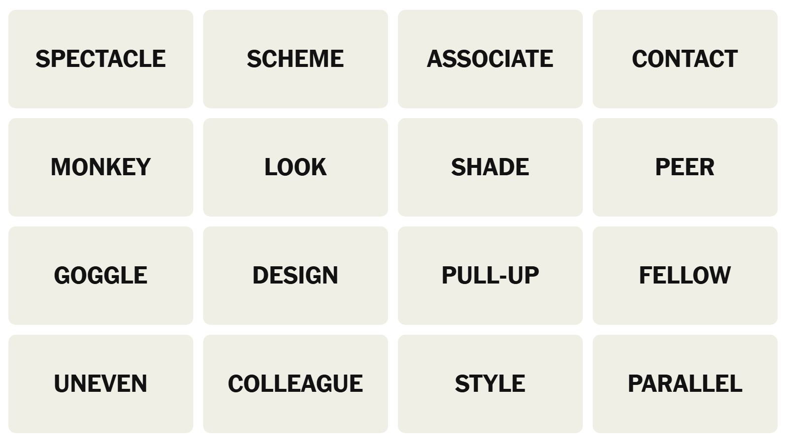 There are sixteen words for the Connection puzzles, which are: