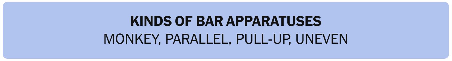 - KINDS OF BAR APPARATUSES – MONKEY, PARALLEL, PULL-UP, UNEVEN