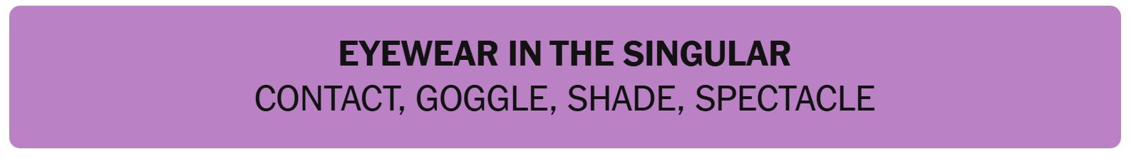 - EYEWEAR IN THE SINGULAR – CONTACT, GOGGLE, SHADE, SPECTACLE