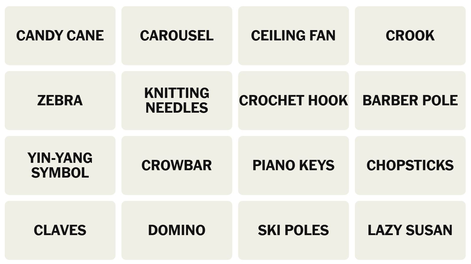 - Hint 1: One of the groups is “RODS THAT CURVE AT ONE END“.
