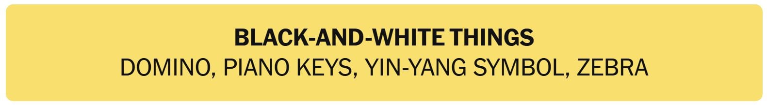 - BLACK-AND-WHITE THINGS – DOMINO, PIANO KEYS, YIN-YANG SYMBOL, ZEBRA