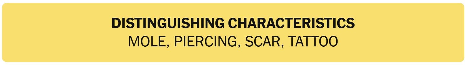- DISTINGUISHING CHARACTERISTICS – MOLE, PIERCING, SCAR, TATTOO