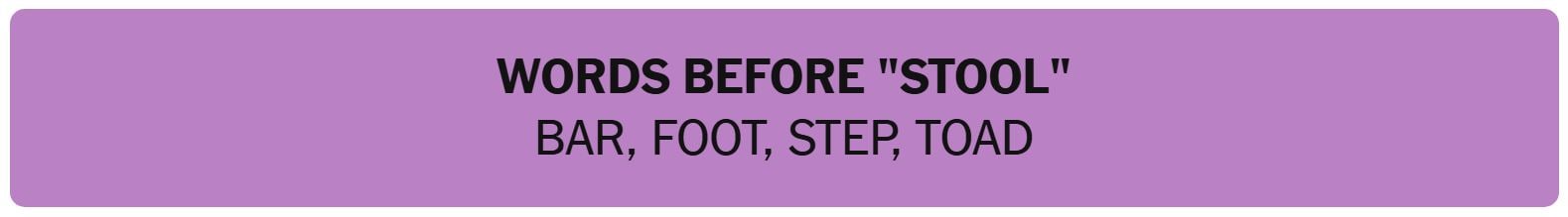 - WORDS BEFORE “STOOL” – BAR, FOOT, STEP, TOAD