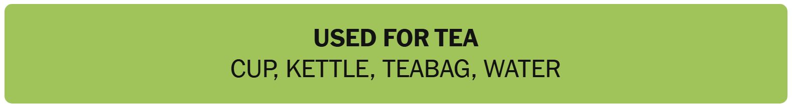 - USED FOR TEA – CUP, KETTLE, TEABAG, WATER
