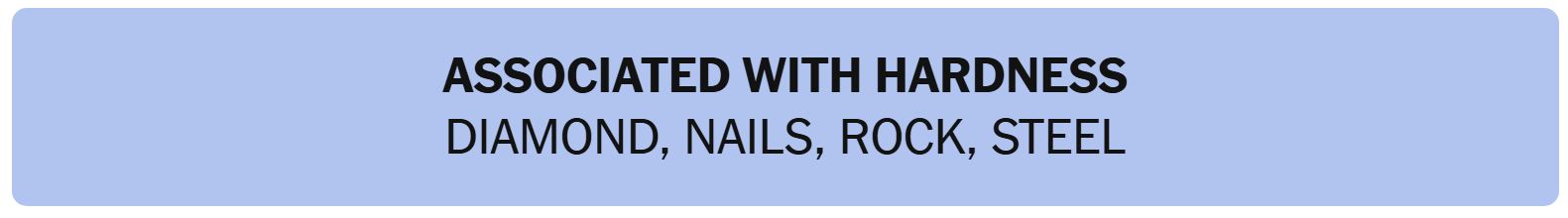- ASSOCIATED WITH HARDNESS – DIAMOND, NAILS, ROCK, STEEL