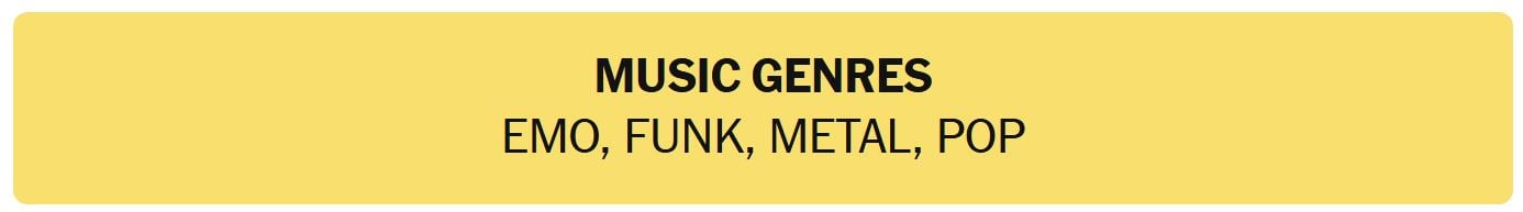 - MUSIC GENRES – EMO, FUNK, METAL, POP