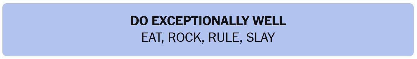 - DO EXCEPTIONALLY WELL – EAT, ROCK, RULE, SLAY