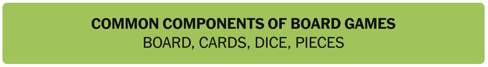 • COMMON COMPONENTS OF BOARD GAMES – BOARD, CARDS, DICE, PIECES