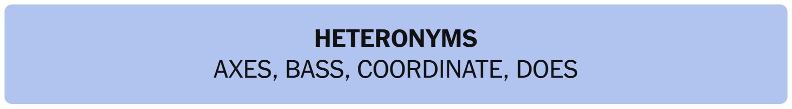 • HETERONYMS – AXES, BASS, COORDINATE, DOES